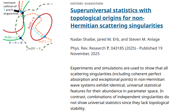 | Submitted: 249. Chung-Yang Wang, Zeming Sun, Thomas Oseroff, Matthias U. Liepe, and Steven M. Anlage, Microscopic Investigation of rf Vortex Nucleation in Nb3Sn Films Using a Near-Field Magnetic Microwave Microscope, arXiv:2511.15116 248. Nadav Shaibe, Jared Erb, Thomas M. Antonsen, and Steven M. Anlage, Universal Frequency Correlations and Recurrence Statistics of Complex Impedance Matrices, arXiv:2508.16563 247. Jared Erb, Nadav Shaibe, Tsampikos Kottos, and Steven M. Anlage, Robust Wave Splitters Based on Scattering Singularities in Complex non-Hermitian Systems. arXiv:2504.18775 _____________________________________________________________________________________________________ In Press: _____________________________________________________________________________________________________ 246. Nadav Shaibe, Jared Erb, and Steven M. Anlage, Superuniversal statistics with topological origins for non-Hermitian scattering singularities. Phys. Rev. Research 7, 043185 (2025). Editor's Suggestion pdf 245. Arthur Carlton-Jones, Alonso Suarez, Yun-Suk Eo, Ian M. Hayes, Shanta R. Saha, Johnpierre Paglione, Nicholas P. Butch, and Steven M. Anlage, Revealing isotropic abundant low-energy excitations in UTe2 through complex microwave surface impedance, Phys. Rev. B 112, 014519 (2025) pdf 244. Isabella L. Giovannelli and Steven M. Anlage, Physical Interpretation of Imaginary Time Delay, Phys. Rev. Lett. 135, 043801 (2025). pdf Editor's Suggestion Physics Synopsis, Popular summaries in New Scientist and Popular Mechanics and ScienceAlert and Phys.org and Science News Today and Spektrum (in German) 243. Chung-Yang Wang, Steven M. Anlage, Microwave microscope studies of trapped vortex dynamics in superconductors Physical Review B 111, 214524 (2025). pdf 242. Jared M. Erb, Nadav Shaibe, Robert Calvo, Daniel Lathrop, Thomas Antonsen, Tsampikos Kottos, Steven M. Anlage, Topology and Manipulation of Scattering Singularities in Complex Non-Hermitian Systems: Two-channel Case, Phys. Rev. Research 7, 023090 (2025). pdf Editor's Suggestion 241. Nadav Shaibe, Jared M. Erb, and Steven M. Anlage, Superuniversal Statistics of Complex Time-Delays in Non-Hermitian Scattering Systems, Phys. Rev. Lett. 134, 147203 (2025). pdf 240. Chung-Yang Wang, Steven M. Anlage, Near-Field Nonlinear Microwave Microscope for Fundamental Superconducting Studies, 2024 IEEE/MTT-S International Microwave Symposium - IMS 2024 Proceedings pp. 998-1001 (2024). pdf 239. Chung-Yang Wang, Carlota Pereira, Stewart Leith, Guillaume Rosaz, Steven M. Anlage, Microscopic Examination of RF-cavity-quality Niobium Films through Local Nonlinear Microwave Response, Phys. Rev. Applied 22, 054010 (2024). pdf 238. Lei Chen, Isabella L. Giovannelli, Nadav Shaibe, and Steven M. Anlage, Asymmetric Transmission Through a Classical Analogue of the Aharonov-Bohm Ring, Physical Review B 110, 045103 (2024). pdf with Supp Mat Popular Summary 237. Jingnan Cai, Robin Cantor, Johanne Hizanidis, Nikos Lazarides, and Steven M. Anlage, Effects of Strong Capacitive Coupling Between Meta-Atoms in rf SQUID Metamaterials. Supercond. Sci. Technol. 37, 075023 (2024). pdf 236. Cougar A. T. Garcia, Nancyjane Bailey, Chris Kirby, Joshua A. Strong, Anna Yu. Herr, Steven M. Anlage, and Vladimir V. Talanov, Disentangling superconductor and dielectric microwave losses in sub-micrometer Nb/SiO2 interconnects using a multi-mode microstrip resonator, Phys. Rev. Applied 21, 024056 (2024). pdf 235. Jared Erb, David Shrekenhamer, Timothy Sleasman, Thomas M. Antonsen, and Steven M. Anlage, Control of the Scattering Properties of Complex Systems By Means of Tunable Metasurfaces, Acta Physica Polonica A 144 (6), 421-428 (2023). pdf 234. Tamin Tai, Jingnan Cai, Steven M. Anlage, Anomalous Loss Reduction Below Two-Level System Saturation in Aluminum Superconducting Resonators, Advanced Quantum Technologies, 2200145 (2023). pdf 233. Shukai Ma and Steven M. Anlage, Experimental Realization of Anti-Unitary Wave-Chaotic Photonic Topological Insulator Graphs Showing Kramers Degeneracy and Symplectic Ensemble Statistics, Advanced Optical Materials, 2301852 (2023). pdf 232. Tornike Ghutishvili, Lei Chen, Steven M. Anlage, Thomas M. Antonsen, Impedance statistics of cable networks that model quantum graphs, Phys. Rev. Research 5, 033195 (2023). pdf 231. Shukai Ma, Thomas M. Antonsen, Edward Ott, and Steven M. Anlage, Time Domain Generalization of the Random Coupling Model and Experimental Verification in a Complex Scattering System, Physical Review Applied 19, 064052 (2023). pdf 230. Farasatul Adnan, Steven M. Anlage, Thomas Antonsen Jr., Edward Ott, Deviations from the Random Plane Wave Field Distribution in Electromagnetic Enclosures, IEEE Trans. Electromag. Compat. 65, 454-463 (2023). pdf 229. Shen Lin, Sangrui Luo, Shukai Ma, Junda Feng, Yang Shao, Zachary B. Drikas, Bisrat D. Addissie, Steven M Anlage, Thomas Antonsen, Zhen Peng, Predicting Statistical Wave Physics in Complex Enclosures: A Stochastic Dyadic Greens Function Approach, IEEE Trans. Electromag. Compat., 65, 436-453 (2023). pdf 228. Alexander J. Millar, Steven M. Anlage, Rustam Balafendiev, Pavel Belov, Karl van Bibber, Jan Conrad, Marcel Demarteau, Alexander Droster, Katherine Dunne, Andrea Gallo Rosso, Jon E. Gudmundsson, Heather Jackson, Gagandeep Kaur, Tove Klaesson, Nolan Kowitt, Matthew Lawson, Alexander Leder, Akira Miyazaki, Sid Morampudi, Hiranya V. Peiris, Henrik S. Rψising, Gaganpreet Singh, Dajie Sun, Jacob H. Thomas, Frank Wilczek, Stafford Withington, Mackenzie Wooten, ALPHA: Searching For Dark Matter with Plasma Haloscopes. Phys. Rev. D 107, 055013 (2023). pdf 227. Benjamin W. Frazier and Steven M. Anlage, The Future of Intelligent Wavefront Shaping for Smart Radio Environments,, in G. Gradoni, M. Di Renzo, A. Diaz-Rubio, S. Tretyakov, C. Caloz, Z. Peng, A. Alω, G. Lerosey, M. Fink, V. Galdi, T. J. Cui, B. Frazier, S. M. Anlage, M. Salucci, A. Massa, Q. Cheng, J. Wang, S. Jin, D. Dardari, N. Decarli, O. Yurduseven,